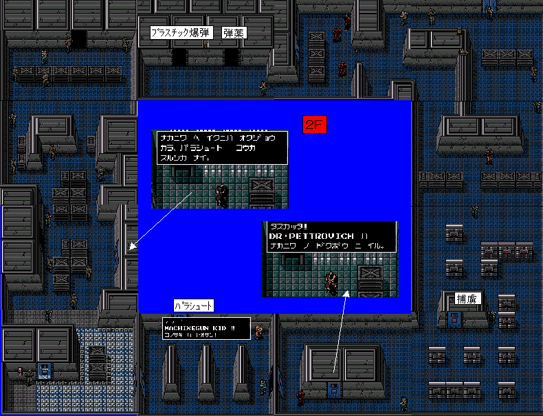 この2Fでの仕事はMACHINEGUN KIDを倒してパラシュートをGETすることだ。このの目的とは・・・Dr.PETTROVICHを救出するために屋上からパラシュートで降下するためだ。任務が終われば、エレベータに乗って屋上へ・・・