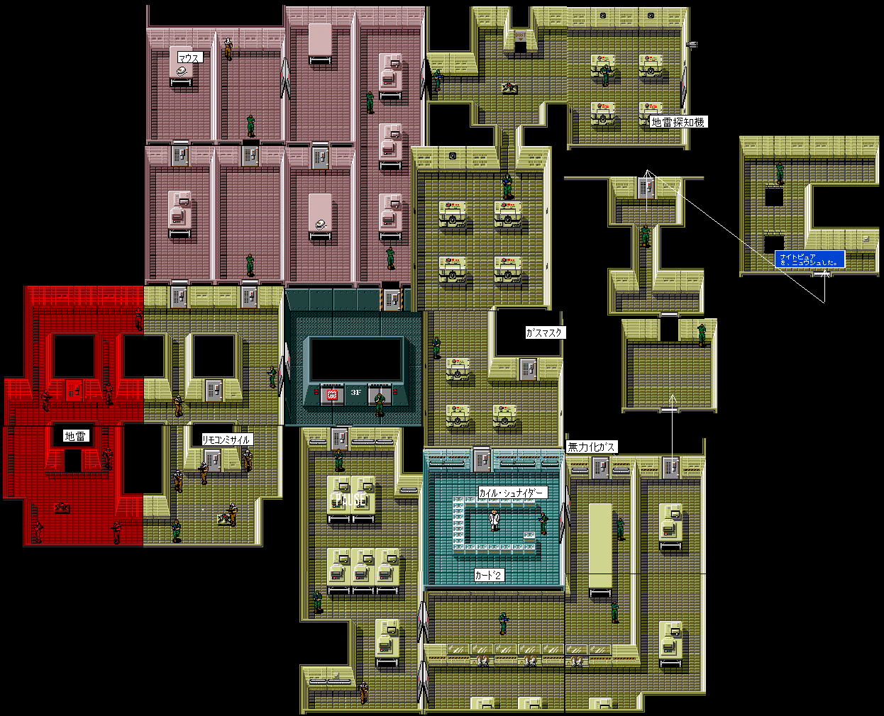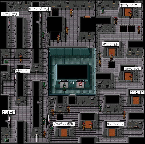 一旦、地下に降りてプラスチック爆弾とサブマシンガンを入手します。ここは落とし穴だらけ、、、十分に注意して進んでください。下のMAPを見れば一目瞭然ですけどね(^^;;