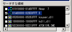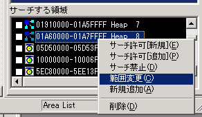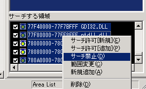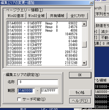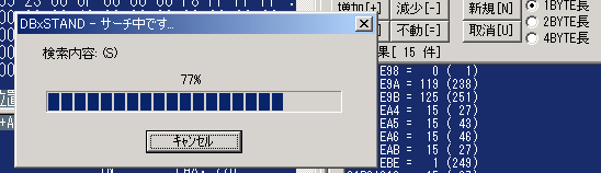 ゲームスタートです。 で、、、、![]() ここで、可愛いっこちゃんが登場。おやぁ。。点滅しています。 どうやら点滅している間は無敵。 魔界村無敵で無敵タイムのサーチです。やり方は ExSTANDと一緒です。 タイムはどんどん減少していっているはず。ポーズをかけては「減少[-]」ボタンを押していきましょう。![]() サーチ結果が20件まで減って 来ました。 更に減って15件。![]() 点滅が止まりました。でも、アドレスは10件も 残ってしまいました。 でも、あやしいのはひとつ・・・ データが0になっている一番上 にあるアドレス・・ですよね(^^ ![]() だから、ここをコード化します。現在地をコード化にして・・・ ![]() 1バイトの最大値FFにして%記号にします。で、OK・・・・ ![]() すると、DBxSTANDではこう表示されます。 「無敵:」はキーボードから入力してやります。別にしなくても いいのですがね。コロン(:)は 半角で入力してやってくださいね。 ちなみに残機減らないのコードはこれです。 アドレスが随分離れているので すっごく苦労しちゃいました。 こんなことはあんまりないのですけどね・・ ![]() ということで、DBxSTANDの簡単講座でしたが、わかっていただけたでしょうか?? 基本はExSTANDと同じです。ただ、サーチ領域を探してやるのが、ちょっと面倒。 これはExSTANDでもまあ、同じなんでしょうけどね。 Sub Heapがありませんかあら、自分で範囲を設定してやる必要があるということ が大きく違う(?)とこでしょうか。 なんせ、Sub Heapにサーチしたいデータがあることが多いですからね。 これで第一回のDBxSTAND講座は終わり。次回は「マーベルランド」を無敵で 遊びましょうか。 でも、池に落ちたり、障害物に挟まれたりすると死んでしまいますからご注意!! |