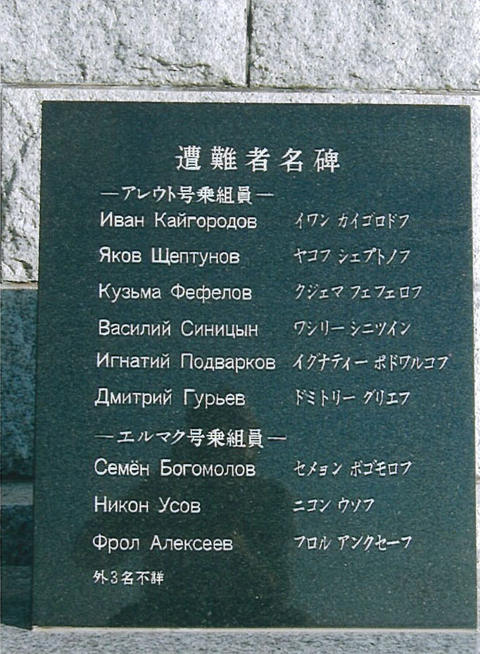 ところが、最近、瀬棚町を訪れた知人がカメラに収めてきた「アレウト号慰霊碑」を見てわたしはあっけにとられた。12名の死者は不詳どころか、慰霊碑の下部には9人の姓名がロシア語とカタカナで併記され、「外3名不詳」と刻まれているではないか。しかも、9名の内訳は、アレウト号乗組員6名、エルマク号3名となっているではないか。「12名の死者の中には、カッター船を漕いでアレウト号残留者を迎えにいったエルマーク号の船員も含まれていたのではないか」という、執筆時のわたしの仮説は仮説でも何でもなく、すでに周知の事実だったのである。