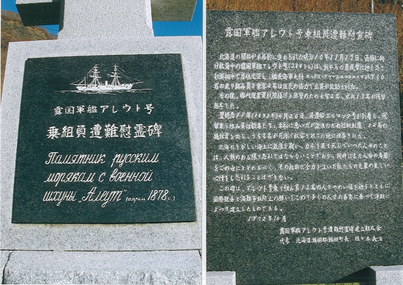 (1) アレウト号慰霊碑建立の1972(昭和47)年当時は、「露国軍艦アレウト号乗組員遭難慰霊碑」の銘版と、慰霊碑建立規成会代表として当時の町長の名が署名された声明版だけだった。(2) しかし、1988(昭和63)年になって、新たに死者9名(外3名不詳)の名を刻んだ「遭難者名碑」が設置された。これは、ソ連邦地理学協会沿海州支部学術書記(当時)ア・ヒサムトジーノフによる町長宛嘆願によるものである。ヒサムトジーノフは嘆願書の中で、死者9名の姓名を明らかにしている。