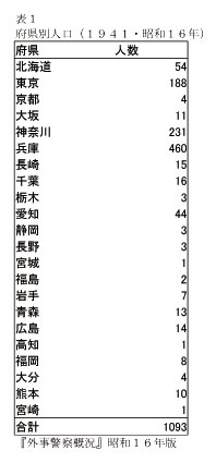 戦前・戦中の在日白系ロシア人総数は、最大時で約1300名。ほとんどが兵庫、神奈川、東京の3地域に集中していた。これらの地域に次いで、北海道、愛知、千葉、長崎、広島、青森、大阪、熊本と続くが、その数は前述の3地方に比較すると極めて少なく、地域別でのロシア人居住者数4位の北海道でも100名に満たない。(表1)なお、当時日本領であった南樺太にも150名ほどのロシア人が居住しており、ポーランド系を含めると200名ちかくに上ったことを付け加えておく。