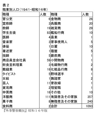 これら白系ロシア人がどうやって生計を立てていたのかは外事警察が調査した職業別人口で知ることができる。太平洋戦争が開始される1941年には、最も多いのが洋服商の111名で、全体の1割を占めている。以下、商店員および会社員(59名)、雑貨商(29名)、金物商(26名)、呉服商(20名)と続く。ちなみにこの5年前の1936年と比較すると、洋服商は40名ほど減少し、化粧品、金物商なども半減している。また、貿易商は20名から2名への激減となっている。詳しくは後述するが、統制経済によるロシア人社会への直接的打撃を示唆するものといえよう。(表2)