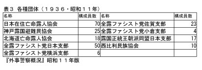 次に、白系ロシア人たちの政治的コミュニティを見てみると、その団体はおよそ20を数えるが、団体相互の連携は希薄で、二、三の例外を除いて、各々の団体自体の活動も低調傾向にあった。外事警察は「経済的不審が政治的関心を喪失させている」と報告している。(表3)