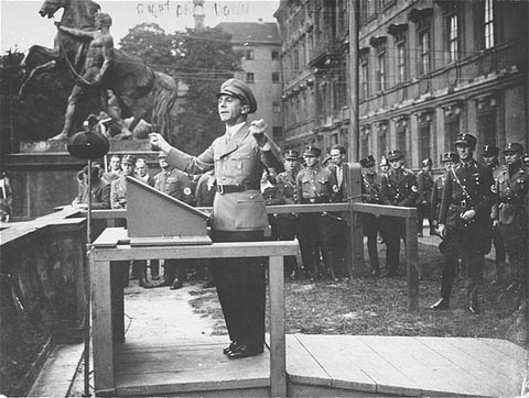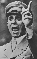 1897-1945 ヒトラーの最も忠実な部下、文学博士、宣伝担当大臣![]() ヒトラーが敗色濃厚で、最も悲嘆に暮れていたときにもっともヒトラーに尽くした人物である。1897年10月29日Rhinelandの中都市Rheydtに生まれる。4歳のとき小児麻痺で左足が悪くなり第一次大戦の徴兵検査で失格となっている。中産階級のカトリックの家庭であった。 幼少時から聡明で、Bonn、Berlinで学んだ後1921年Heidelberg大学でロマン派文学の研究をし文献学の博士号を取得している。彼の若いころの思想は反ブルジョワではあったが、反ユダヤ主義は見られない。彼はゲーテ研究家のユダヤ人文学史教授Friedrich Gundolfの指導を受けていた。また、昔の婚約者がユダヤ系であったりしている。 新聞社への入社に失敗しCologneの銀行で9ヶ月働いた後、1922年にヒトラーの演説をミュンヘンで聞きNSDAP入党を決意。当初はナチの北ドイツ指導者Gregor Strasserの秘書などをしていた。彼は党内の左派に属していたのでヒトラーをブルジョワとして追放の提案さえしていた。ヒトラーは翌1926年4月、ゲッベルスをミュンヘン蜂起の記念すべきビアホールに招いて説得したが、以来ヒトラーの最も忠実な部下となる。 1926年以降心酔するようになりやがてヒトラーから当初未開拓だったベルリンの大管区(Gau、ナチによる新行政区分)長(Gauleiter)に任命されるようになる。ベルリンではDer Angriff(攻撃)という新聞を発行。ベルリンでは、ユーモアとウィット、皮肉に富んだパーフォーマンスで市民の人気を得るたり、大学生のほとんどをナチのシンパにしてしまう。 任地で成果をあげた後、1928年から国会議員、そして1929年にはナチ党のプロパガンダ全国責任者を務めるようになる。"Heil! Hitler"を導入したのは彼である。いわゆる「ヒトラー神話」の創生につとめ、当初12しかなかった国会の議席を4年後には230にまで膨らませるのに大いに貢献した。 ヒトラー政権獲得後、33年35歳で国民啓蒙宣伝大臣となり、また帝国文化院(Reichskulturkammer)長をつとめマスコミや出版、芸術や文化の統制にあたる。強制的同一化(ナチ化)を進める一方、全国へのラジオの配布、35年3月にはベルリンに限られたが世界初のテレビサービスを開始した。37年から38年にかけてチェコの映画女優と浮気騒動がおきて一時妻との離婚騒動が起きるが、ヒトラーの仲介で事なきを得、二人の関係は第二次大戦開始後一層親密なものとなる。しかし戦争開始当時は、戦勝に次ぐ戦勝で彼の活躍は特に目立たなかった。最後の2年間、敗戦が続く中、ゲッベルスは国民を鼓舞しヒトラーへの支持をつなぎとめる役割を果たした。ことにスターリングラードでの大敗北後1943年2月18日に行った「総力戦」という言葉を使って国民に呼びかけた演説は有名である。。 敗色濃厚の時期には、すっかり意気消沈して閉じこもりがちでうつ状態となっていたヒトラーに代わり、空襲を受けた都市を視察したり、救助隊の組織をして国民の賞賛を得た。最後にはヒトラーの遺言により首相に任命されたが、時既に遅くヒトラー自殺後の5月1日、6人の年端もいかぬ子供たちを妻が殺し、そして妻とともに自害した。その光景はまさに悲劇としかいいようがない。 |