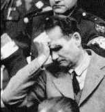 | 総統代理だったが、講和を結ぼうと単独でイギリスに飛んで捕まる。凡庸な人物。 1894年4月26日エジプトのアレキサンドリアで貿易商の子供として生まれる。14歳になってはじめてドイツに渡る。第一次大戦に志願兵として参加した後、Munich大学で政治学を学んだが、トゥーレ(Thule)協会という反ユダヤ組織の影響を受けるようになる。また、Karl Haushofer教授の拡張主義や生存圏(Lebensraum)の理論にも影響を受ける。 ![]() ビヤホールでヒトラーの演説を聞き1920年7月ナチ党に入党。16番目の党員となる。ヒトラー一揆に参加し、ヒトラーとともにLandsberg要塞に投獄される。そこではヒトラーの個人秘書として『わが闘争』の口述筆記を行い、ヒトラーに生存圏やナチスの組織について助言を行っている。釈放後、1925年からはヒトラーの個人秘書として数年間過ごす。1932年には党中央政治委員会議長、親衛隊指揮官になる。 1933年にヒトラーが首相になると、無任所相、党の副総統に任命される。そこでは後に権勢をほしいままにするマルティン・ボルマンを部下にして、ヒトラーの秘書としての業務をこなす立場にいた。また、39年にはゲーリングについで3番目の後継者に指名されている。彼は、ヒトラーにひたすら狂信的に奉仕する存在で、他の幹部のように権力を追求するところがなかったし、その能力にも乏しかった。そのため、部下のボルマンが次第に実質的な秘書として頭角をあらわし、ヘスは戦争で忙しいヒトラーから次第に疎んじられるようになる。 こうした立場を挽回しようと、ベルリンオリンピックで会ったことのあるイギリスのHamilton公爵を通じ、当時ドイツが攻略に苦しんでいたイギリスとの和平を実現しようと行動をおこす。1941年5月、アウグスブルクからメッサーシュミット機で単独公爵の住むスコットランドのGlasgowに飛び、パラシュート降下する。ドイツ国務相総統代理ルドルフ・へス和平提議のため来英したことを告げ説得を試みるが、精神的に不安定なところが認められ、結局チャーチルにもヒトラーにも相手にされずロンドン塔に拘禁された。 ヘスは以前から、オカルトに凝りだしていて、ノストラダムスなどの予言書やお告げを信じ込んでいたようである。そして予言の解釈について繰り返し妻に聞かせるなど、精神面での問題を既に以前から指摘されていた。 ヘスがいなくなってからヘスがトップにいた総統代理幕僚部はヒトラーの特別命令で党本部になり、そのトップにはボルマンがつき、ボルマンの権勢がいよいよ大きくなっていったのである。 ニュルンベルクの裁判では、ヒトラーへの忠誠を全く後悔していない旨の発言を行う。結局終身刑となり、西ベルリンのSpandau刑務所で過ごす。1987年8月17日にニュルンベルク裁判で最後に残った囚人として93歳で自殺した。*右の写真はニュルンベルク裁判でのヘス =[逸話]= ミツバチとスズメバチ ヒトラーは、ミツバチは幸い多く賢い動物だと信じていたが、スズメバチは嫌っていた。彼に言わせると、スズメバチはちゃんと巣をつくることはできない。また、ミツバチの敵で、ミツバチの巣から何でもかんでも盗んでしまうということである。スズメバチの巣を見つけると、彼は巣を庭のホースと石油でメチャメチャにしてしまった。午後のお茶に、みんなで蜜のついたパンなどを食べていると、スズメバチがやってくる。ヒトラーが砂糖水を入れた深めのビンを置かせると、スズメバチはその底に潜って落ちてしまうのだった。これもヒトラーに言わせると「ミツバチは頭がいいからこんな罠にはかからん。」ということになる。 ルドルフ・ヘスが一度、このスズメバチ撲滅作戦を見て同情し、ビンの中から一匹を助けてやったことがあった。この助けられたスズメバチはただちにヘスの口に向かい、舌をチクリと刺した。舌は腫れ上がり、ヘスは息ができなくなって病院に担ぎ込まれ、気管に穴を開けることでようやく事なきを得た。ヒトラーは心配していたが、面白がってもいた。「ヘスは人が良すぎるんだ。それがどんな結果を生むか、ごらんの通りだ。」と、ヒトラーはますます自身をつけてしまった。 |