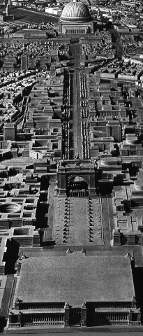 Tessenow教授の下で助手を勤めた後、大不況の最中1931年NSDAPに入党。やがてヒトラーの目にとまり、純粋に建築への興味が一致したことから、ヒトラーのお気に入りとなる。ヒトラーが政権をとってから、いくつかの建築の業績を示した後、新しい首相官邸の建築を命ぜられる。しかも1年という期限つきで。 シュペーアは見事に期待に答える。次にはベルリンを世界の大首都Germaniaに改造するという壮大な計画を任せられる。これは1950年代を目標とするものだった。戦争でこの計画が中断した後、武器大臣が交通事故で死亡したため、その後任となる。 ![]() ここでもまた、旧来の官僚的な生産体制を打ち破って見事に生産増強に貢献する。戦争末期は、ヒトラーの焦土作戦に反対したり、保存すべき建築のリストをつくったりした。しかし、ニュルンベルクの裁判では禁固20年の判決を受ける。1966年Spandau 刑務所から釈放される。その後は手記などを書いて大いにに売れた。 *右図ベルリン改造計画:Germaniaとしてドイツ否世界の首都になるという構想であった。 ◇Topics--------◇ 有名なパリ訪問の写真は、1940年6月にヒトラーがSpeerを含む3人の芸術家を引き連れてパリ市内の建造物などを3時間ほど視察したときの写真である。この後、ヒトラーはパリの破壊を止めパリに負けない世界の首都としての"ゲルマニア"構想をシュペーアに語る。 それは凱旋門がパリのものの2倍以上の120メートルで、第一次大戦の戦死者180万名の名前が刻まれる予定だった。巨大なドームである大会堂は15から18万人を収容し、高さ290メートル直径250メートルという途方もないものだった。凱旋門の4メートルにもなる大きな模型は、1939年ヒトラーの誕生日の贈り物としてシュペーアが披露している。 |