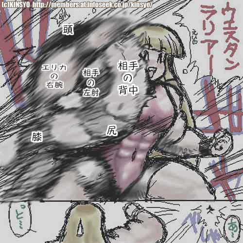解像度上げて修正した。でも雑。 で、やはり比較したい、と言う事で通常(?)な人とのからみ、がテーマ。 で、普通じゃ面白くないのでこういう場面。 あれだけぶっとい腕だと(普通の人相手なら)上半身丸ごともっていかれてしまうだろうとこういうことになった。 まあ、ふたコマ目は愛嬌で。 それでもし、この構図でエリカが160cm以下だとすると相手の身体にほとんど隠れてしまうので絵的にエリカの身体を大きくしたら、鋭くツっこまれました。(長身エリカとの比較) また、ちょっとなにがどーなっているのかわかりづらいっぽいので下に解説をつけます。 ま、胸で受けたんでしょうが←のようになって顔も腹も打ってるはずです、たぶん。 まああまり深くツっこまないで気楽にね |
