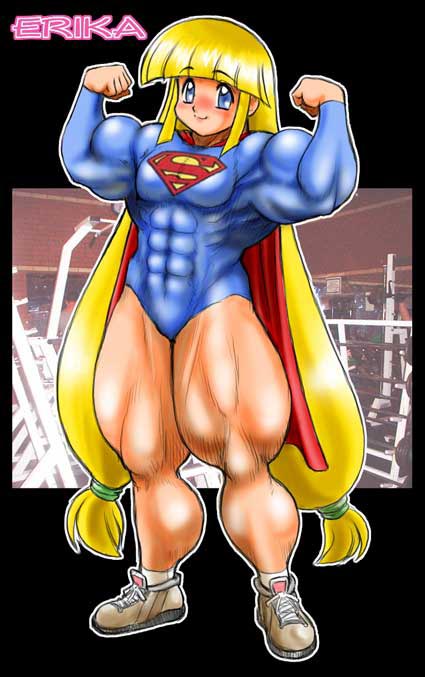 お絵書き板ではないもの パソコンでやりました・・似たようなポーズだけどまあ、最初なんで・・なかなか頭身が合わず四苦八苦。まだまだダメ。 腹筋とかはっきり見せたいからぴったりフィットするモノを着せたついでにスーパーマンマーク・・と、必然的にマント。 上半身はまだなんとか・・足の筋肉がわかんないので随分てきとー・・ エリカのデータ 年齢11歳 141cm 80kg前後?カナダ人(父親)とのハーフ。でも英語はできないらしい。姉がいるようだ。 これだけ筋量があるといろいろある。 膝上のハイソックスを履きたいが太股まで入らない。ゲームで盛り上がりまさに力が入りコントローラーがもたないことがしばしば。ランドセルの肩ヒモを背負う時、上腕部分で腕を曲げたひょうしにちぎってしまった。指定の体操服が腕や太股でつっかえて全部特注。器械体操のピラミッドは常に一番下。運動会の棒倒し・綱引きなどは参加不可・・など(笑) 意外に苦手なものも・・・ 投てきとかは人並み、ドッヂボールとかみんなとやって問題無し。走るのが苦手、内太股がぶつかってたいへんらしい。ジャンプは人並み以下、やはり重いのか。泳ぎは苦手、浮くのは得意。殴る蹴るの動作は苦手。 自慢は・・・ 髪の毛。からだの柔らかさ、股割り余裕。 ・・・てな感じ ライバル??にブラック・エリカがいるらしい |