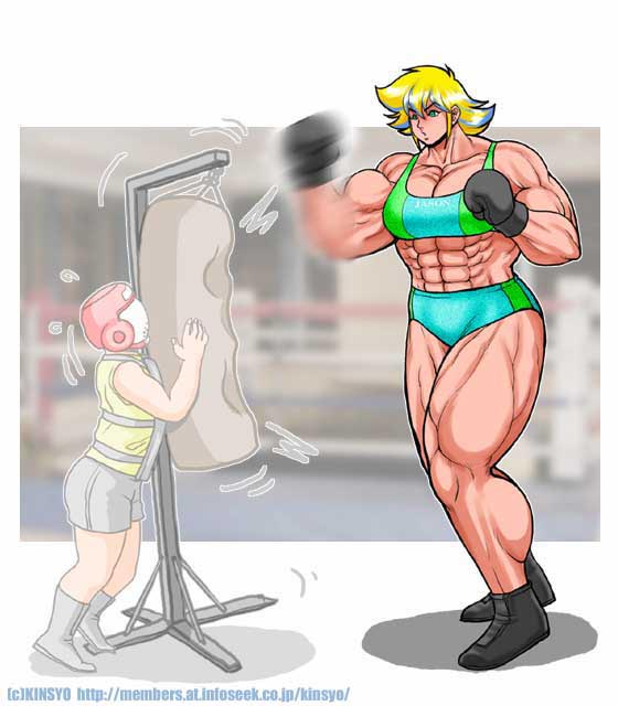 ボクササイズ‥のつもりではじめたジェイソンだが真面目な分中途半端に学ばない。 格闘技をやっていた分飲み込みも早い。250cmの巨体からくり出される早いパンチはとてつもなく重い。 サンドバッグ打ちも軽く打っているが、体重が乗ったパンチは威力充分。後ろで支えていないとサンドバッグが飛んでいきそうだ。 ジェイソンは汗一つかかずにリズミカルにパンチを打ち込む。後ろで支えている人間の方がもたない。 充分に打ち終わると実戦形式でやってみたいと言い出した。もちろんこの巨体のジェイソン相手をできる男はいない。 指導員は同じくボクササイズをやっているジェニファーやマリー、リンダに頼んでほしいと言ってはみたが、是非、と押し切られちょっとだけスパーリングしたそうだが‥(^_^; ◇◇◇◇ 指導員の身長は175cmくらい。たぶん本当は後ろでも支えてられない衝撃だと思います(^_^; |