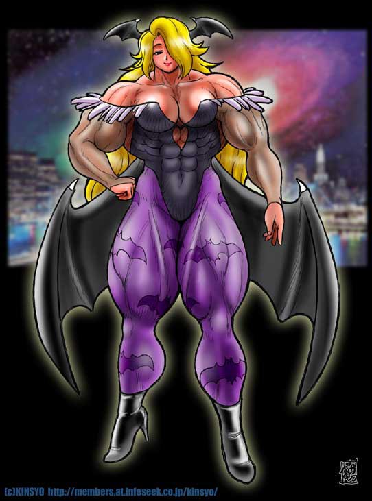 外からの月明かりに浮かび上がった大きな影に、思わず上体を起こす。目が暗闇に慣れるのにしたがい、それが巨大な筋肉に覆われた女だと気付く。 誰かと口を開く前に彼女の指が口を塞ぐ。 「あなたの強い欲望が私を呼んだ・・・あなたの望みを叶えてあげる・・」 彼女はそういいながらベッドに上がってくる。自分を跨ぐ体勢になると、ゆっくりと両腕を曲げ、恐ろしく、美しい、その巨大な肉体を誇示する。 「さめない夢を見せてあげる・・・」 ゆっくりと優しく彼女は抱き寄せる・・ その翼に隠されるまでもなく、彼女の身体に埋もれていく・・・いや、ゆっくりと押し潰されていく・・ 「さあ、おやすみ」 彼女が自分を肉塊にしてしまうわずかの間に・・永遠の夢を見るのだ・・・ |