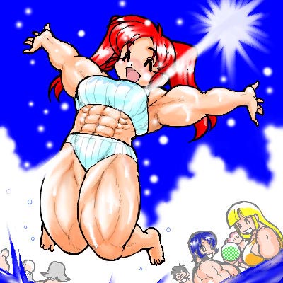 海水浴などに行くと真由美は全力ではしゃぐ(笑)今回の海水浴でもいろいろ楽しんでいる。真由美の大好きなオリビアは来ていなかったが、2.5mを超える超巨体、かつ超筋肉の女の子達も来ている。真由美はその中でも一番小柄。それを利用した。 紗耶佳や涼子達に頼んで飛び込み台代わりになってもらった。水深を差し引いても、持ち上げてもらえば3m近い高さになる。その飛び込みをはじめたら太郎やエリカ達もそれに習った。 さらに発展させ、放り投げてもらってさらに高くから飛び込んだ。失敗を考えると普通すすめはしないが、真由美の頑丈さは皆の知る所であったので好きなようにさせていた。 これはその一場面。飛び込んでから飛び出した所。 真由美の運動能力の高さはかなりのモノで、握力などはすでに握力計(100kgまではかれる)では測れないほどある。脚力も海の中からジャンプして飛び出すほど。 これだけ超巨体がそろっていると真由美が溺れそうになったり怪我しそうになってもあっという間に救出してもらえる。その安心感もあってか、涼子は日が暮れるまで飛び込み台をさせられていたりする(^_^; |