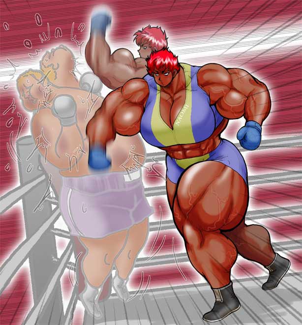 構える暁に対し、悠然と立つナオミ。暁は自分が見上げなければならない相手は初めてだ。ナオミの身体は全て筋肉に覆われているばかりか、そのあまりの筋肉の太さはばかばかしいほどだ。 恐怖を覚えつつも暁は突進した…しかし、ナオミは暁より大きい。普通の相手なら暁が近づいただけで下がるだろうが、ナオミには通じない。 暁は自分の距離からハンマーブローをくり出すが…ボディへのパンチは鍛え上げられた腹筋に防がれ、サイドからのパンチはその太すぎる腕の筋肉で簡単に弾かれ、顔へのパンチはその異常に盛り上がった大胸筋に阻まれた。 暁は絶望した、この怪物には、正になにも通じない…それどころか…あの剛腕でくり出す攻撃はいったいどんなものになるのか…背筋が寒くなった。 ナオミはその暁の攻撃をあしらうと、反撃…いや、試合を終わらせにかかった。 |