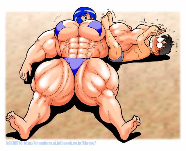 | 優美もいつも太郎に仕掛けてばかりじゃない。 時には太郎に好きにさせることだってあるのだ。 「ほら、いいよたろにい♪」 そう言って優美はごろんと寝転がった。太郎も超巨体を見なれてるとはいえ、まだ小学校高学年の従姉妹のあまりの筋肉の発達ぶりに、改めて驚いた。 「どんな技でもいいよ〜でもあんまり痛くしないでね〜」 リラックスして大の字になる優美。盛り上がった筋肉は脱力してたわんでいるが、そのボリュームにはやはり圧倒される。太郎としても、なにをかけてもこの肉体に効くとは思えず、しばらく呆然と優美の身体を見下ろしていた。 「…ね、優美の番でいいの?」 まだまだ大きく発達しそうな超乳筋の向こうから顔を上げて優美が言う。 太郎は意を決した。 こういう時は単純な技に限る! 「おりゃー!」 太郎は優美の左腕を掴むと腕ひしぎ十字固めをかけた!…が、優美の身体が分厚過ぎて足がかからない、上腕が太すぎて股に挟むというより抱え込むのがやっとで肘をしっかり引き付けられない。 なにやら優美の腕にしがみついているナマケモノの様になった。 しかし、そこからでも関節はきめれる! 「ぬお〜〜〜!!」 太郎の気合いの声と共に優美の左腕の先に体重と力をかけた。 「お?おお?けっこうきいてる〜♪」 なぜか嬉しそうに優美が言う。 「ふんぬ〜!!!」 太郎が渾身の力を込めると優美の力の抜けた筋肉がゆっさゆっさと揺れた。 |