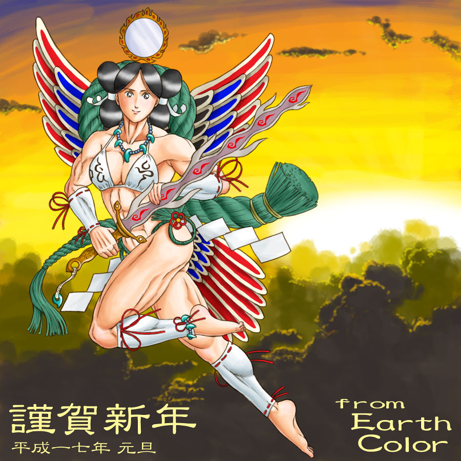 新しい年の幕開けに相応しい神々しい筋肉娘さんです(^o^)/ アマテラス的なデザインに鳥の羽をあしらったコスチュームが素敵で…それを来ているのが筋肉女神♪
