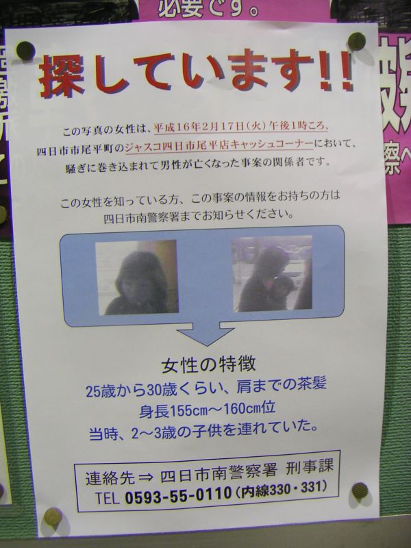 | 919 名前:ハム太2号 投稿日:05/02/17 23:50:27 ID:rdngT5kX 本日18時頃、オビジャに献花しました。 ATMコーナー脇に粗末な献花台が一基のみ。 私の分を除いて5束が供えられていました。 今日一日でわずか5人だけだったのか? 台上には以下の文言が・・・ 「昨年当店のATMコーナーにて不幸な事件が発生いたしました 一周忌を迎えお亡くなりになられたお客様には 改めて心よりご冥福をお祈り申し上げます ジャスコ四日市尾平店」 「不幸な事件」と一言でスルー。 「お客様」と表現し、「窃盗犯」とも「冤罪被害者」とも 書かないことで、ジャスコの見解・責任もスルー。 予想していた事だが、改めて失望する。 仕方が無い。公開写真のポスターへと目を移すと・・・ 920 名前:ハム太2号 投稿日:05/02/17 23:52:39 ID:rdngT5kX 玄関に張られた、 シャウト女についての情報提供ポスターは B5用紙程度の小さな張り紙が2枚のみ。 それも問題のATMコーナーの出入り口のみで 他の出入り口には何もない。 ポスターの文面は以下の通り。 「さがしています。 この女性は平成16年2月17日火曜日午後1時ごろ 四日市市尾平町のジャスコ四日市尾平店キャッシュコーナーにおいて 騒ぎに巻き込まれて男性が亡くなった事案の関係者です。 この女性を知っている方、この事案の情報をお持ちの方は 四日市南警察署までお知らせください。 女性の特徴 : 25歳〜30歳くらい 肩までの茶髪 身長155センチから160センチくらい 当時、2〜3歳の子供を連れていた 連絡先 : 四日市警察南警察署刑事課 電話 : 0593−55−0110 内線330 331」 そうか・・・警察にとっては「事件」ですらなく「事案」なのか そして、公開された写真が2枚。しかし、それは・・・ 921 名前:ハム太2号 投稿日:05/02/17 23:53:55 ID:rdngT5kX ボヤけた糞画像が2枚のみ!! 正直、ワザと映像をぼかしたとしか思えない。 解像度の低いプリントの赤・黄の滲みが一面に広がっている。 一枚は女性の正面写真。 目は横長。エラが出ている顔つき。 髪は肩すじまで伸びたセミロング・ストレート。 今日の夕方、TV放映されたものと同じ写真だが、 TVの写真画像の方がまだマシであると明言する。 もう一枚は、子供を抱えた横顔写真。 横顔なのでシャウト女の顔はさらに判りにくいが、 子供の顔は正面に写されている。 どうも、人形ではなく生身の子供のようだ。 乳児ではなく幼児で男の子っぽいが、 いかんせんこれも解像度が低すぎてどうしようもない。 それ以前に子供の顔はどうでもいいし、 子供には罪が無い。子供の顔写真を出して人権上許されるのか? さらに絶望を深めた写真二枚だが、無いよりマシか。 そう思いつつデジカメでポスターを撮影しようとすると・・・ 922 名前:ハム太2号 投稿日:05/02/17 23:56:23 ID:rdngT5kX な、なんと警備員が慌てて撮影を遮断するではないか! 以下、警備員とのやりとりの様子 (要点だけで一言一句このままと言ったわけではない) 漏れ「なんで撮影の邪魔をするのか?」 警備「当店では撮影禁止となっている」 漏れ「法律上撮影禁止ではなく、店のルールとして禁止ということか?」 警備「その通り あなたの身分・事件の関係は?」 漏れ「身分は言いたくない この店には初めて来て、事件の関係者ではない ポスターが今日貼られると聞いて撮影しようとしたが禁止なのか?」 警備「その通り」(携帯でどこぞに連絡。上司らしき警備員飛んできた) 漏れ「扉の外からポスターを写すのも駄目か?」 警備「扉の外も敷地内なので、店内撮影になるから駄目だ」 ・・・あきらめた。 悔しいので「お客様ご意見コーナー」に 「これからも集団リンチ殺人をウヤムヤにしてください」と 嫌味を投書して帰る。 どうせこれもスルーだろうが、善後策を考えて出直したい。 というわけなので、画像は一切無い文章だけのレポート。 |