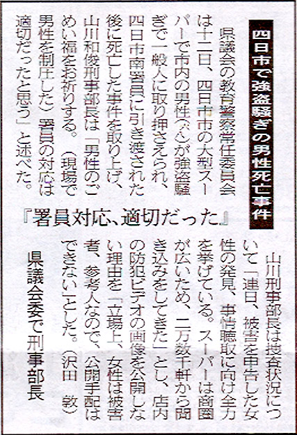 県議会の教育警察常任委員会は12日、四日市市の大型スーパーで市内の男性(68歳)が強盗騒ぎで一般