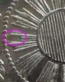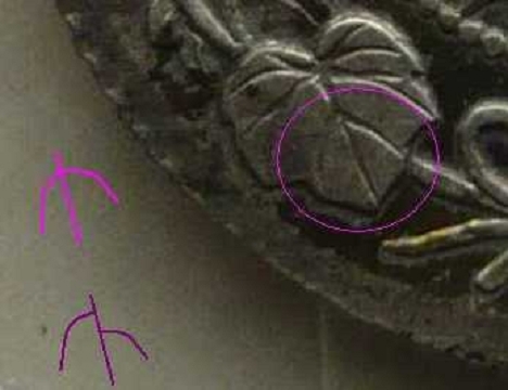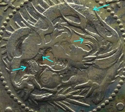 龍図面の玉と玉の間が、金型がわれてバリのようになっています(青矢印部) また、赤矢印部が欠落しかかっている事が分かります 3画欠日が有名ですが、本品は2画欠日ですね。