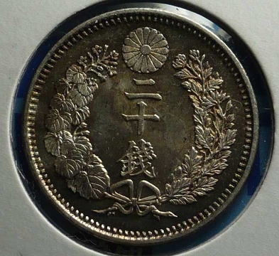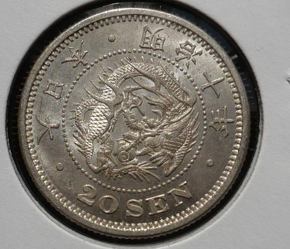 「状態」 未使用 この年号は刻印の出来が悪いものが多く、未使用でも菊葉や「二十銭」の文字がつぶれた物が多いですね。 龍のウロコも作りが雑な感じがします。 |