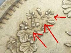 「手変わり」 よく見ると文字は刻印が修正された 痕跡が多数見られます。 文字の一部欠落したものも、この年号 では非常に良く見かけます。 まさに近代貨幣創世記の製造技術の 苦難状況を伝える貨幣です。 |