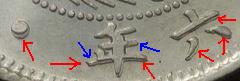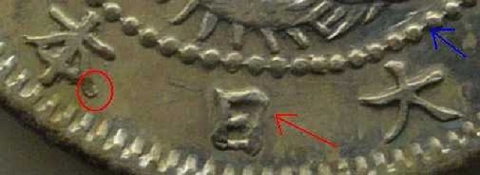 欠日、欠年などが有名ですが本品はその補刻跡が多数見られます。赤矢印部が補刻跡、青矢印部が補刻したものがまた欠落した状態になっています。 この年号は文字に手変わりが多く、上級者ごのみな様でちょっとした手変わりにオークションで高値がつきます。 例)左長本太年 極+で6万円(銀座コインオク2007) |