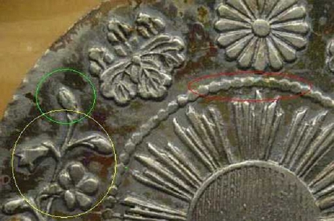 旭日面の玉(赤囲み)は隣の玉とくっついてしまっています。 緑、黄色囲みを見ると、この年号にしては厚印がきれいに 出来ている事がわかります。