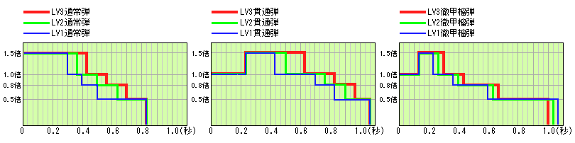 貫通弾と徹甲榴弾は、発射後 1.0倍 ⇒ 1.5倍 ⇒ 1.0倍 ⇒ 0.8倍 ⇒ 0.5倍 のように変化