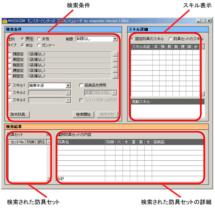 本プログラムは、モンスターハンター2に対応したスキルの表示・検索を行なうツールです。