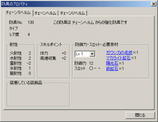 各画面で表示される防具名上で右クリックし、ポップアップメニューから 『プロパティ』 を選択すると、左図のように、防具の情報画面が表示されます。 その防具の下位モデル、上位モデルなど関連する防具がある場合は、それらの防具の情報も同じ画面で見ることができます。 必要素材名をクリックすると、当サイトのアイテム詳細画面がブラウザによって開かれます。 |