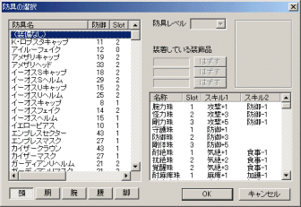 固定防具表示部の右端にある5つのいずれかのボタンを押すか、防具名部分をダブルクリックすると左図のような防具選択画面が表示されます。 指定したい防具と、必要に応じて防具レベル・装着する装飾品を選択します。 ここで表示される防具・装飾品は、検索条件フレームにて指定した性別・タイプ・制限に合致するもののみとなります。 |