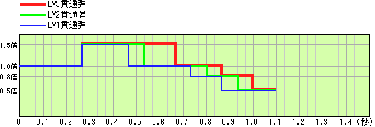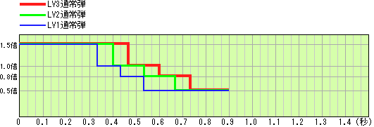 下のグラフは、発射後の時間と共に変化する弾の威力を表したものです。