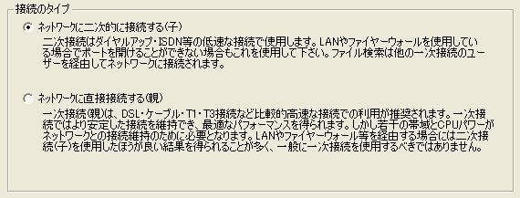 | 親[一次接続] | 5000 | WinMXでの検索速度が速い、検索結果が多い、接続が安定する、 チャット部屋建て可能。 |