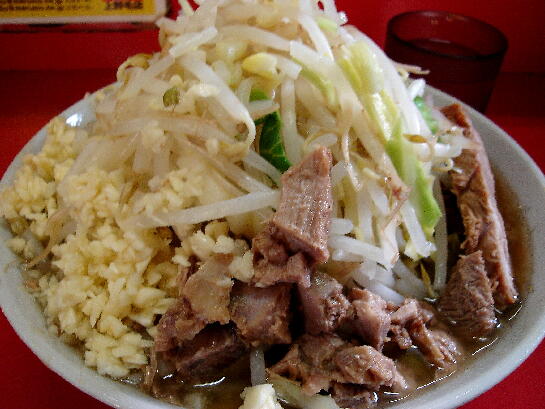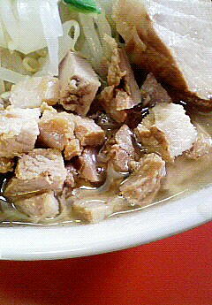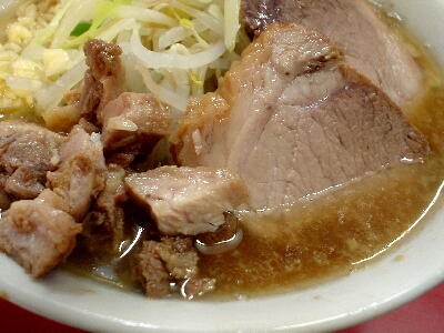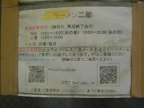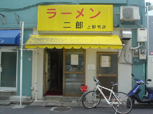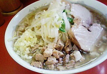 ラーメン二郎上野毛店 住所:世田谷区上野毛1-26-16 MAP 最寄駅:東急大井町線上野毛駅 営業時間:月〜金 11:00〜14:00 18:00〜22:00/土 11:00〜14:30頃 定休:日・祝 ![]() ![]() カウンターにはコショウ、唐辛子。レンゲ有り。 2009.3.10(TUE) 13:15頃到着。 待ち客2人。 厨房には店主と坊主頭の助手さん。 天気がよく開け放たれた窓からの風が心地よい。 ![]() 小ラーメン 野菜にんにく¥700 どんぶりが少し大きめなのかな? 見た目より野菜がたっぷりでなかなかの盛り。 最後まで麺と野菜を半々で食べ進めるような感じだった。 にんにくの量も豪快。 豚はスライスが3枚に、上野毛の特徴こま切れ豚が足される。 豚の量も小としては多目。 全体的にこれぞ二郎といった盛りで後半はかなり苦しかった。 スープは非乳化。 表面に塊の背アブラはほとんどなし。 しかし豚の出汁がしっかり出ていて物足りなさは感じない。 後味甘目の仕上がりでうまい。 麺はほどよい柔らかさ。 もちもちとした太麺とスープの一体感が味わえる。 最後までアゴも疲れなくていい・・・・と、思うのはおじさんになった証拠か。 店頭には立川店オープンのポスターが貼られたままだった。 そういえば立川店主は後半上野毛で修行していたんだったな。 2008.4.23(WED) 11:10到着。 開店すぐだが店内ほぼ満席。 ![]() 券売機の上の扇風機がヘリコプターのような音をたてている。 ![]() 小ラーメンニンニク少し ¥650 スープはすっきりとしながらもコクがある。 ややカラメで昔と比べると二郎らしいワイルドさが定着したようだ。 野菜は少なめ。 豚は大ぶりのが2枚にこま切れ肉。 ![]() 麺はやや細め。 若干柔らかめの茹で上がりだが先代の時ほどではなく、僕には硬め指定のいらない範疇かな。 量はさほど多くない。 帰りには外待ち2人。 以前は行列無しで食べられたが確実にお客さんが増えているようだ。 2007・5・24(THU) 久しぶりに辰屋に向かう。 開店10分前の11:20に着くと店先のホワイトボードに本日11:50からと書かれている。 それならばと陸に向かうが途中で気づく。 今日定休日だ。 シャッターの閉まった陸の前を走りぬけ環八へ出てそのまま久しぶりの上野毛まで足を伸ばす。 11:45到着。 店内丁度満席。 店主が二代目に代替わりしてからは初めての訪問。 助手さんと共に常連さんとわきあいあいと会話している。 前店主の時にはみなかった空気感だ。 厨房の配置も変わった気がする。 カウンター側にある調理台が以前は厨房の真ん中にあった気がするけど気のせいかな・・・ ![]() 小ラーメンニンニク¥650 味付玉子¥100 スープの表面は厚めの液体アブラの層が覆う。 ノーコールでも結構カラメ。 昔の目黒を思い出す。 麺は若干細めでツルツルとした食感。 少し柔らかめの茹で上がり。 豚は脂身のないものが2枚に、細かく切ったものがプラスされていた。 ![]() 味付玉子は固ゆでの一歩手前。 ![]() 2006・7・10(MON) 11:00頃到着。 先客5人。 店内はかなり蒸し暑い。 入り口に置かれた扇風機もぬるい空気をかきまぜている状態。 ![]() 小ラーメン 麺少なめ¥650 以前は荻窪に通じるすっきりとした印象のスープだったが、この日は大目の液体アブラ、細かい背脂、ガッツリと効いた醤油、そして微乳化、といっ たコクとパンチのある三田直結の仕上がりだった。 野菜、麺共に丁度良い茹で上がり。 うまい! 久しぶりの上野毛だが予想外の変化に大満足。 ブタは相変わらず脂身の少ないタイプでツナっぽい食感。 ![]() ![]() 2005・9・16(FRI) 13:00頃到着。 店内ほぼ満席。 券売機には新メニューのニラキムチが。 先月の26dayで提供され好評だったのでレギュラーメニューになったようだ。 二郎でニラキムチといえば関内が先にやっているが、関内にはなかなか行く機会がないので上野毛で食べれられるのはありがたい。 ラーメン界全体で考えるとニラキムチといえば卓上に無料の薬味として置いてあるところが多い。 東京より関西の方が多いようだが、最近では大阪の「神座」東京進出の際に対抗して、今や都内どこにでもあるチェーン店「花月」でも置くようにな った。 ![]() ラーメン麺少なめにんにく¥650 ニラキムチ¥100 まずはニラキムチを一口。 有料なだけあってしっかりとした味のキムチだ。おいしい。 オキアミ等を使った深みのある味がするな〜と思ってよく見てみると、予想通り小エビが混ざっていた。 ニラ以外には細切りになったにんじんが入っておりシャキシャキとした食感を出していた。 甘めのスープとの相性もいい。 ただ、後半かなりスープが支配されてしまったので、僕としては別皿で提供されると理想的。 合間につまみながらラーメンを啜ってみたい。 この日の野菜はほぼキャベツだった。 ぶ厚い豚は柔らかく、脂身もプルプルで最高。 麺も丁度よい茹で上がりだった。 関内に行けてないので「にんにく+ニラ」という組み合わせだったは「諭吉」以来だったが、やはり強烈な匂い。 仕事中の人は無理だろう。 昼の部の訪問だったので食べてるのは僕だけだった