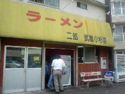 ラーメン二郎武蔵小杉店 住所:川崎市中原区上丸子山王町1丁目1393 MAP 最寄駅:東急東横線・JR南武線武蔵小杉 営業時間:11:15-14:00 17:00-麺切れ終了(20:00頃) 定休日:火曜 ![]() ![]() カウンターにはコショウ、唐辛子。レンゲ有り。 2007.11.5(MON) 12:45頃到着。 先客7名でちょうどカウンターが埋まっている。 奥の座敷は電気が消えて使われていない。 厨房には茶髪の二代目店主と若い助手さん。 ![]() ラーメン麺少なめ¥550 野菜は生に近い茹で上がりでシャキシャキ。 麺は表面は若干デロっとしているが中心はホギホギとした歯ごたえがある。 いつもの小杉らしい乳化してないすっきりとしたスープ。 先代の時はカラメで丁度良かったが二代目店主はデフォでしっかりと醤油ダレが効いている。 ライトなスープの仕上がりは昔の仙川を思い出させる。 現状では荻窪が一番近いタイプかな。 豚は四角いバラ肉が2枚。 タレの染み込みは浅いがその分豚自体の味が味わえてよかった。 2006・9・7(THU) 06年6月に前店主が雪が谷大塚にこじろうをオープン、同時に助手さんであった息子さんに代替わりした武蔵小杉を訪問。 11:45到着。 先客6人。 すぐに席に着けるとはラッキー。 その後またたく間に10人待ちになったのでタイミングが良かったようだ。 ![]() ラーメン麺少なめにんにく¥550 以前はタレ薄めが基本だったスープだが、今回は丁度良い濃さだった。 新店主はこのバランスでいくのかな。 乳化してないライトな仕上がりだが旨味はしっかりしている(当然化調は強めだが)。 麺はこれ以上滑らかでも、これ以上細くても、二郎らしさを失うという一歩手前の絶妙なバランス。 小杉の麺は本当にここでしか味わえないうまさがある。 野菜は少なめ。 他の人のを見るとそれなりの盛りだったので、麺少なめということで自動的に野菜も少なめになったようだ。 ![]() 豚は僕の大好きなバラ肉。 幸せ。 東京ラーメンの趣を感じさせるバランスの取れた豚出汁醤油ラーメンだった。 2005・8・26(FRI) ![]() 開店5分前に到着一番乗り。 予定通り11:15に開店。 開店時には僕を含め3人。 年季の入った店内に巨大な扇風機が風を送り込んでいる。 カウンター一番奥の席へ。 座ってすぐに気づく。 うわっ・・・この席厨房の熱気が伝わってくる・・・道路側が正解だったかな・・・ ![]() ラーメンにんにくカラメ麺少なめ ¥550 「コスギだけどウススギ(でもうまい)」というくだらない駄洒落として、 僕の脳にインプットされている小杉のイメージがこの日は完全に崩された。 まずは麺を一口すする。 うまい! 麺に絡んだスープからうまみを感じる。 まるで本店のようだ。 次に直接どんぶりからスープをすする。 おお!! がっつり醤油が効いている!! 目黒以上新代田未満な感じ。 これならカラメコール無しでも大丈夫だったな。 がっつりカネシと、二郎らしい、けど全てがほどよく大人しい小杉のスープの組み合わせがたまらない。 変化する前の本店の味ってこんなだったのかな〜と勝手に想像してみる。 麺は本店よりはやや細い気がする。 ホゴホゴとした二郎らしい食感がたまらない。 ![]() 四角いばら肉の豚は絶品。 これならいくらでも食べられそうだ。。。 小杉のスープは食べ進めるとだんだんと豚の香りや後味の甘味が効いて来る。 食後の舌のしびれも他店よりは少ない気がする・・・・・まあ、勝手な思い込みかもしれないけど。 2004・6・2(WED) 11:15分頃到着。待ち客2人。到着と同時にシャッターが開く。 僕を含め3人しか居ないので余裕をもってカウンターに座る。それにしてもここはカウンターの長さに対して椅子の数が多い。全てに人が座ったらギ チギチだろうな。 ![]() ラーメン ニンニクヤサイカラメアブラ ¥550 二郎らしいボソッとした平たい中太麺。硬めの茹で上がり。うまい。 スープは相変わらずの薄さ。二郎の中で一番薄いかも。かといってそれがダメという訳ではなくここならではの個性となっている。僕にはカラメアブ ラで丁度良い。後からきた団体はカラカラメにしている人が多かった。アブラは細かい背脂がスープの表面に足される。スープのタレの味はみりん の甘さ控えめなのでカラメにすると醤油がたった感じになる。 ヤサイはもやし80%キャベツ20%シャキッとした茹で上がり。 豚は中ぶりだが厚みがある。脂身多めで柔らかくうまかった。ただ、休日前に仕込んだ豚だったのかな?脂身はちょっと古くなってきてる匂いがし た。 2004・4・7 12:00頃到着。待ち客10人。 店内はカウンター9席と奥に座敷のテーブルがひとつ。 お昼時なので結構混んでいた。 ![]() ラーメンにんにく野菜アブラ¥550 味付け卵¥50 できあがり「どうぞ〜」とカウンターの上に置かれるが、どんぶりに並々とスープが入っている。更にどんぶりはスープで熱々、油でべとべと、こぼさ ないよう注意しながら降ろす。 スープはコクがなかった。アブラもなぜかほとんど増えておらず物足りなかった。カラメコールもすればよかった・・ 野菜は茹で上げを鍋から麺