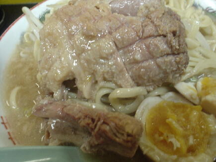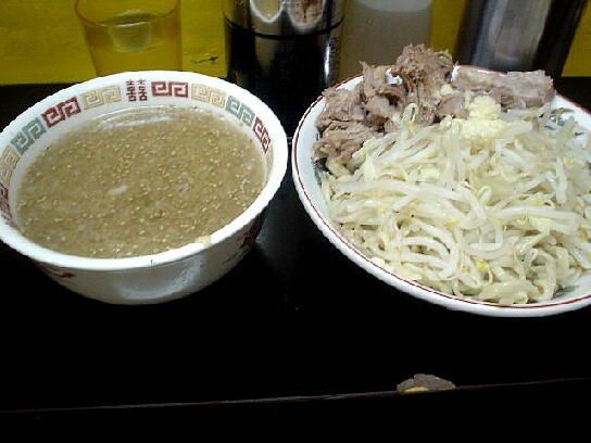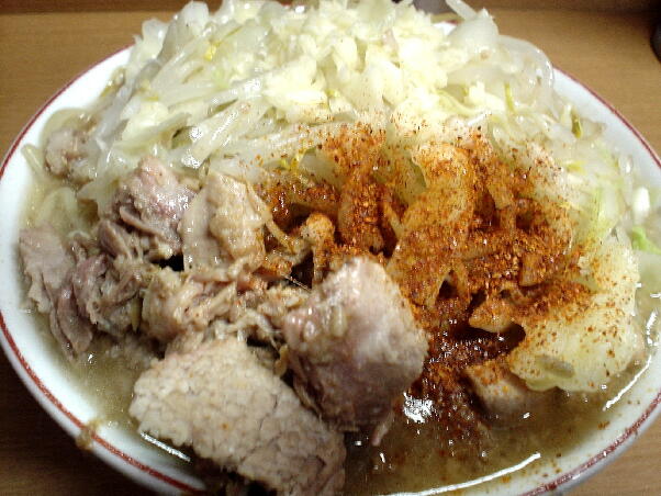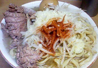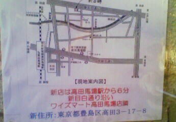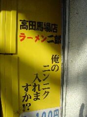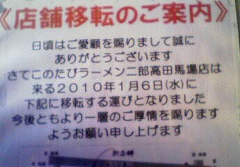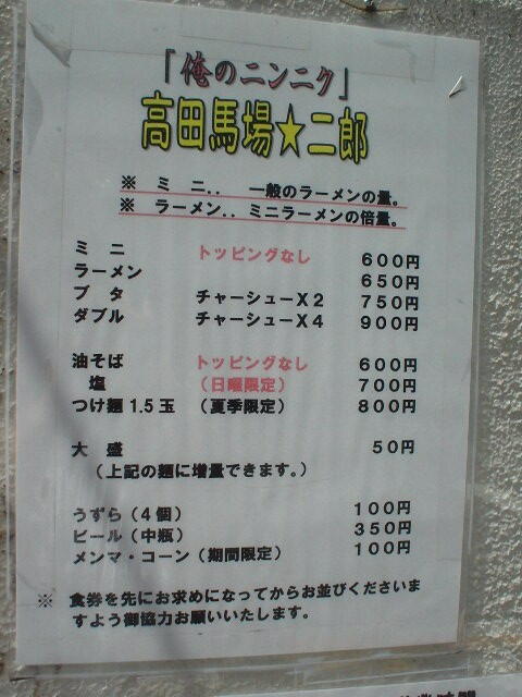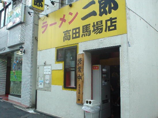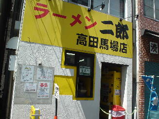 ラーメン二郎高田馬場店 2010.1.6より 住所:豊島区区高田3-17-8 MAP 最寄駅:JR山手線・営団地下鉄東西線・西武新宿線 高田馬場 2010.1.6より ラーメン二郎高田馬場店(旧店舗) 住所:新宿区高田馬場3-12-1 MAP 最寄駅:JR山手線・営団地下鉄東西線・西武新宿線 高田馬場 営業時間:11:00-14:00 18:00-21:00 火昼のみ 定休日:土・祝 ![]() ![]() カウンターにはコショウ。レンゲ有り。 唐辛子はトッピングコールで可。 2009.12.14(TUE) 14:00頃到着。 待ち客4人。 店頭の張り紙を見るとなんと移転のお知らせが。 しかも今月は昼営業のみらしい。 タイミングがよかった。 ![]() 移転先は駅の反対側。 エリア的には「べんてん」がある方。 ![]() ![]() 店内に入るとカウンター上の荷物棚がなくなっていた。 すでに移転に向けていろいろ整理しているのだろう。 ジュースの自動販売機も撤去されていた。 ![]() 厨房には店主と女性の助手さん。 店主の姿を見るのは久しぶりだ。 ![]() 煮玉子ラーメン ニンニク唐辛子 ¥750 豚は馬場にしてはめずらしく崩していないブロック状のものだった。 ドンブリ自体が小さく量的にも目黒の小くらいだった。 スープ表面の液体アブラの量がものすごかった。 当然引き上げる麺すべてがコーティングされ まるで油そばを食べているようだった。 麺は中心がもっちりとした食感だった。 帰りに移転先に寄ってみるとそれらしき工事中の店舗があった。 ![]() ここだとすると店舗面積的には小さくなりそうだ。 まあ、もとの店舗が二郎としては立地が最上級だっただけで少し位 駅から離れても何も問題ないだろう。 考えてみると三田、小金井、野猿、府中、相模大野と二郎って結構移転している。 2008.9.2(TUE) 14:00頃到着。 二人待ち。 店頭には新たに立派な営業中の板が。 ![]() リニューアルしたようで若干内装が変わっていた。 入り口左側に券売機が移動。 値上げとともにメニュー名も変更したようだ。 ![]() 以前と比較すると ミニラーメン→ラーメン ラーメン→ドカ盛ラーメン 大盛→ドカ盛麺増し券 ということかな。 初心者にはいいかもしれないが、二郎慣れした人には逆に紛らわしいかも。 僕の前の男性はミニがなくなってどれを買えばいいか迷っていた。 水は蛇口の給水機から。 残念ながら冷却水ではなく普通の水道水だった。 ![]() その横の以前券売機があった場所に自動販売機が設置されていた。 コップとレンゲが金属製に。 金属のコップを見るとつい歯医者を思い出してしまう。 ![]() 厨房には男性が二人。 今回も店主の姿は無し。 カウンターの上には扉つきの荷物入れが設置されていた。 ![]() 奥のテーブルが置かれていた小部屋は壁にむかって新たにカウンターが設置されていた。 ![]() ラーメン にんにく唐辛子 ¥650 麺は表面が若干ツルツルとした仕上がり。 中心は二郎らしいホゴホゴとした食感。 量はさほど多くないが、以前のミニよりは多目かな。 ![]() スープは乳化しているが若干ライト。 唐辛子のトッピングで丁度良いパンチに。 唐辛子は香りが高く結構辛め。 カウンターに置かず、トッピング制にしているので風味が保たれているのだろう。 ![]() 豚は高田馬場名物「崩し豚」 切り分けているところ見ていたら何枚という形だったので、意図的に崩しているのかな。 柔らかい仕上がりなので僕はどちらでも構わない。 店内はかなりの熱気で、唐辛子の効果もあわさって、食べ終わるときには汗だくに。 昼の部は14:30までかと思ってあせって来たら営業時間が変更になっていた。 どおりで帰るときにもお客さんがどんどん来ていたわけだ。 ![]() 2007.12.4(TUE) ![]() 13:00頃到着。 7人待ち。 高田馬場は店頭以外にも奥の階段にも人が並んでいるのであなどれない。 ![]() 先に券売機で食券を購入。 ミニと新メニューの「半熟煮玉子」のボタンを押す。 ![]() 店頭でしばらく待つと助手さんから「奥の階段へどうぞ〜」と言われたので移動する。 地下へ続く階段で常時4・5人待っている。 ![]() 階段で10分程待って席へ。 厨房には男性が二人で店主の姿は無い。 ![]() ミニ(トッピング不可)¥600 半熟煮玉子¥100 以前は乳化していないすっきりとした堀切っぽいスープだったが、この日は乳化したコクのあるスープだった。 うまい。 麺は平たい太麺でホゴホゴとしたまさに二郎!といった麺。 豚は箸で持ち上げると繊維がホロホロ崩れていく柔らかさ。 味の染み込みも丁度良い。 ![]() 半熟煮玉子は黄身に熱が伝わりきる直前の仕上がり。 ![]() 一之江から新店はかなり本店に忠実になっていて各店で高レベルな一杯を食べる事ができる。 贅沢をいえば食べ歩く身としてはそれ以前の、例えば新代田と荻窪といったような同じ二郎とは思えないような店の違いを愉しめなくて寂しい気も する。 そんな中、一之江以前ということで考えれば高田馬場はかなり本店に近い一件なのかもしれない。 今回の乳化スープはよりそう感じさせた。 ![]() 2006・8・14(MON) ![]() 12:45頃到着。 空席2つ。 ![]() 店内にもトッピングの説明の張り紙があり初心