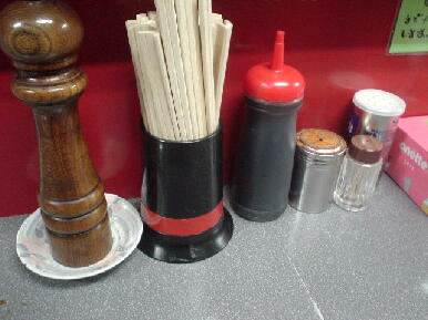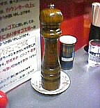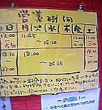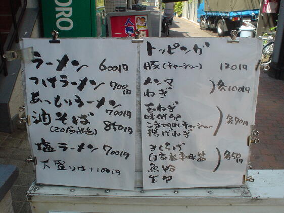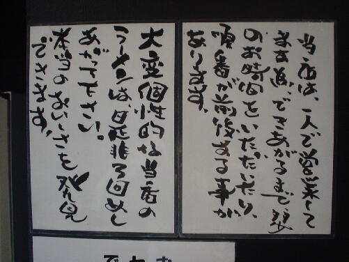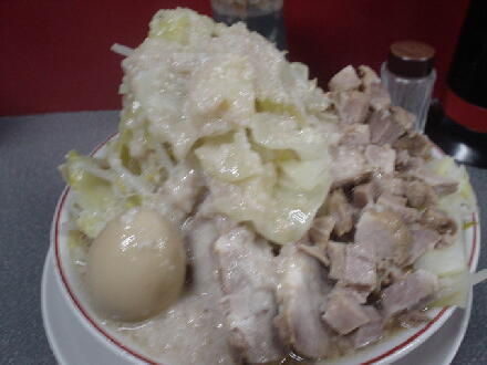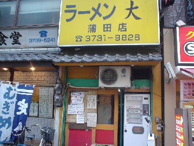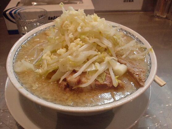 ラーメン大蒲田店 旧二郎蒲田店 住所:大田区蒲田5-1-5 MAP 最寄り駅:京浜東北線・東急池上線・東急多摩川線 蒲田 定休日:無 ![]() ![]() カウンターには白・黒コショー、唐辛子、醤油ダレ。レンゲ有り。 2008.5.6(TUE) 移転した大蒲田店を訪問。 位置的には以前と線路を挟んだ反対側。 まわりは夜ともなれば魅惑のネオンに囲まれるエリア。 店舗が道路から奥まっている為、道路の看板がなければ通り過ぎてしまいそうな店構えだ。 ![]() 13:30頃到着。 店内に入ってみるとびっくり12名待ちだった。 入ると通路のようになっておりその奥に厨房とカウンター。 広々とした店内で12名待ちでもスペース的には余裕。 ![]() 入ってすぐ右に券売機。 ![]() カウンターは最近の他の新しい大と一緒のオールメタリック。 L字型で8席。 ![]() 厨房にはコック服の男性が一人。 客は帰るときまで99%男子学生(見た目判断) ![]() 給水器はカウンターの右奥。 ![]() 無駄の無い動きで店員が頑張っているのだが、さすがにこれだけの行列に対し一人だと限界が在るようで、列が一向に進まない。 結局、着いてから食べ始めるまでに一時間もかかってしまった。 ![]() ラーメン大盛りにんにく少し¥700 揚げねぎ¥70 スープはコクが薄めだったが大量の背脂の甘味と大さじ一杯投入された白い粉でそれなりのパンチに。 野菜はノーコールだと大した量では無いが、コールするといきなり山盛りになるようだ。 豚は以前は薄い長方形だったが今回は二郎系らしい四角い塊りだった。 麺は若干細め。 堀切系らしいホギホギとした食感。 硬めの茹で上がり。 ![]() 揚げねぎが忘れられていたので乗せてもらう。 ![]() 揚げねぎ風味を楽しむためににんにく少なめにしたのだがそれでも若干にんにくが強く、大量の背脂と絡むと思ったより揚げねぎの存在感は消え てしまった。 にんにく無しでも良かったかも。 ![]() 旧店舗 住所:大田区西蒲田 7-4-9 MAP 最寄駅:京浜東北線・東急池上線・東急多摩川線 蒲田 定休日:無 メニュー:ラーメン600 つけラーメン650 塩ラーメン700 塩つけめん800 油そば850 大盛り100 チャーシュー120 メンマ100 煮玉子70 (食券ではなくコール時のトッピングメニュー各50 →)生卵 玉ねぎ こま切れチャーシュー ![]() ![]() ![]() ![]() カウンターには白・黒コショー、唐辛子、醤油ダレ。 2008.4 移転 2006・3・11(SAT) 17:00に到着。 15分遅れで17:15に開店。 奥から詰めて座るように指示される。 ![]() ラーメン 野菜アブラ¥600 煮玉子¥70 こま切れチャーシュー¥50 野菜はそれほど高くは見えないが、柔らかく茹でられたものがギッチリと盛ってありそうとうな密度。 はじめの5・6口は完全に野菜のみをやっつけないと麺までたどりつかない。 アブラコールしたのでその上に白いドロドロの背脂が大量にかかっている。 トッピングコールに対する素晴らしいサービスだ。 相変わらずこま切れチャーシューも50円とは思えない量の多さ。 煮玉子は黄身がねっとりとした仕上がり。 四角く縮れたゴワゴワ麺も硬めの茹で上がりでうまい。 ただ、野菜、こま切れチャーシュー等の影響でかなりスープが冷えてしまった。 2004・11・1 店名が二郎から大へ変更される。 2004・1・2 ![]() カウンターには白・黒コショー。唐辛子はコールで可。 ![]() 複雑な営業時間 お正月もやっているということで蒲田へ。 12:15到着。開店したばかりだが4人待ち。 ![]() 入り口に置かれた使用済みティッシュとおしぼり入れ。通常おしぼりは女性のみ何も言わなくても出てくるようだ。 さて10分ほど待って着席。先客の出来上がりを眺めていたのだが「野菜コール」をした客への野菜の盛りが素晴らしい。わざと高めに盛っている が6・7cm位ある。前回はじめて来た時は野菜コールをしなかったのだがこれは一体???いつもこうなのか?それとも胸に新人のプレートを着け た彼の時だけなのか?それともお正月サービスなのか?いずれにしても堀切系とは思えない嬉しい誤算だった。夫婦で来ていたおばさんはあま りの盛りにびっくりして、見事カウンターから出来上がったどんぶりを降ろすのに失敗、カウンターをスープだらけにしていた。 先日行った三田でも失敗していたおばさんがいたが、その時はどんぶりの外側がはじめから油でヌルヌルしているという三田ならではの理由によ るものだった(他店でもあるが。。初めての方はご注意を)。 つけラーメンの食券を出すと「あったかいのも出来ますよ〜」とのことなので、そちらでお願いする。 ![]() ![]() つけラーメン にんにく野菜¥650 期待通りの野菜の量。麺の量が二郎の中では少ないとはいえ、ほとんど麺と変わらない位の野菜の量だった。キャベツ80%もやし20%柔らかめ の茹で上がり。 あったかいつけ汁には刻んだ長ネギ、唐辛子、こま切れチャーシューが少しづつ入っている。幅広のメンマも入っていた。 あったかい麺の上に野菜、堀切系の小さな豚2枚。どっちりとした麺はつけ麺にもあっている。 濃い目のつけ汁に生卵を落としてもおいしそうである。 最後はス