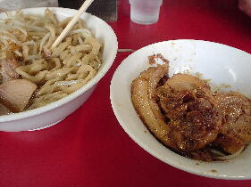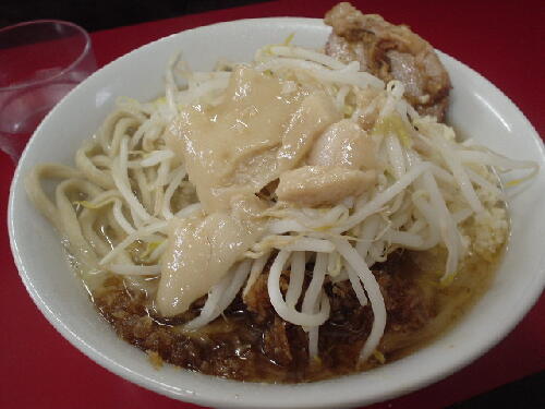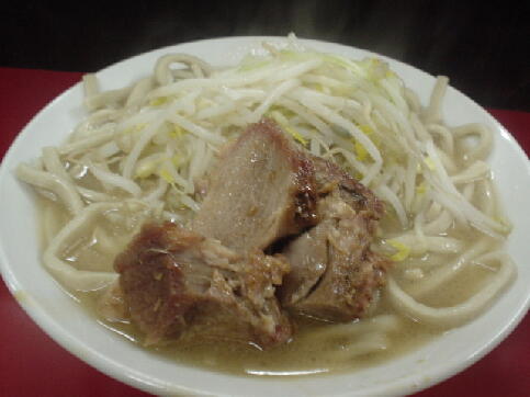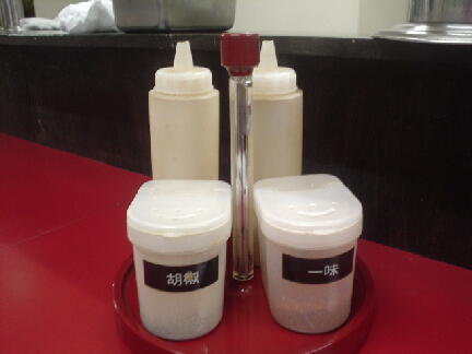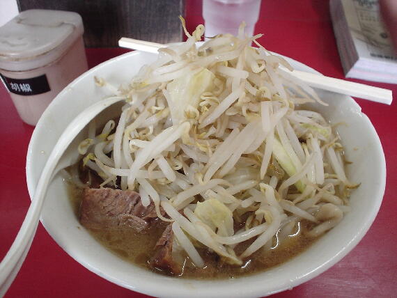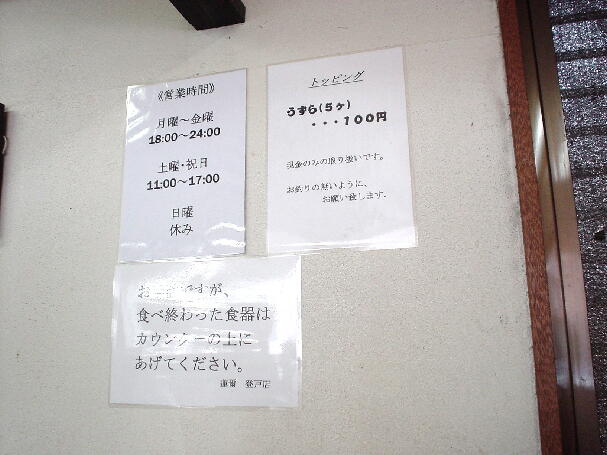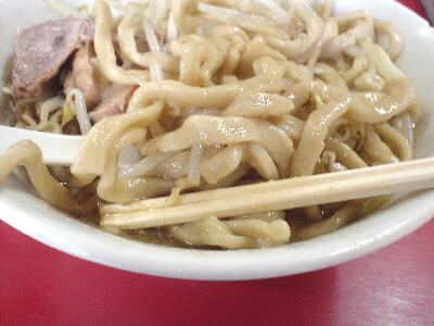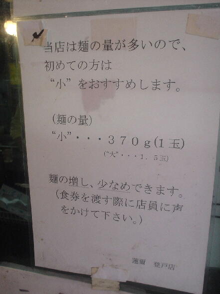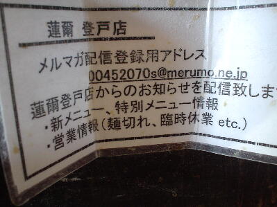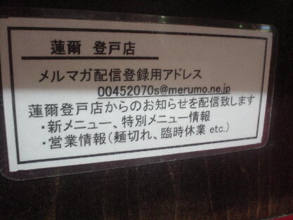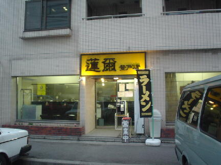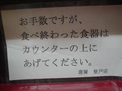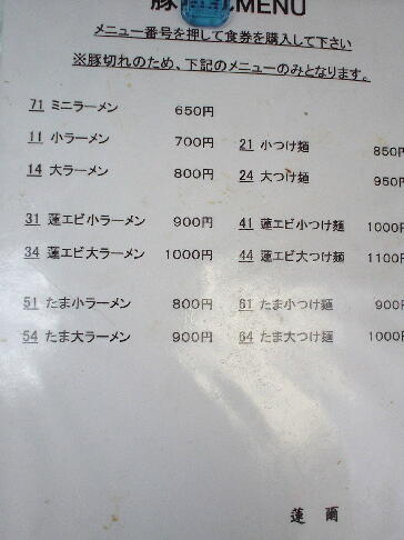 蓮爾 登戸店 住所:川崎市多摩区登戸1770 MAP 最寄駅:向ヶ丘遊園 登戸 営業時間:平日18:00〜24:00 土・祝11:00-17:00 定休日:日曜日 ![]() ![]() カウンターにはコショウ、唐辛子。レンゲあり。 2008.6.14(SAT) 13:30頃到着。 券売機が故障のため直接店員へ、という張り紙がされていた。 メニューが値上がりしていた。 なんだかメニューが少ないと思ったら、この日は豚切れメニューだった。 ![]() 店内には待ち客一人。 営業時間も変更になっていた。 土曜祝日が通し営業になったようだ。 ![]() 厨房には店主と若い男性の助手。 ![]() 入って正面の壁に巻きチャァの張り紙があったので一緒に注文する。 僕が頼んだ直後助手さんが張り紙を剥がした。 ラスト1だったようだ。 ![]() 蓮エビ小 麺少なめ¥900 ドンブリにはどうみても通常の四角い豚しか入っていない。 「これって巻きチャァ入ってますか?」 「後から別皿で提供しますから」 ちょっと厚めの@状チャーシューが小皿で提供されるのかと思いきや 3分後 なんだこれ!! ラーメンドンブリと大差ない口の広さの皿にトグロを巻いた肉が! ![]() ぶ厚い角煮を無理やり巻き付けたかのような迫力だ。 ![]() 巻きチャァ¥150 もちろん枚というよりは塊といった形状で、横から見てもあまりの厚さに横だか正面だか裏だか分からない。 ![]() 甘辛の醤油タレの味がかなり濃くついており、さらにその上に醤油タレがザバッとかけられている。 肉の下には野菜とコンビーフ状の細かい肉の繊維が入っている。 はっきりいって一個でも十分すぎるほどお徳なのに、巨大なかたまりが二個! ものすごいサービスメニューだ。 麺少なめにしていたからギリギリ食べ切れたが、途中隣の見知らぬ男性に一個おすそわけしようかと思うくらいのボリュームだった。 旧蓮爾時代と同じホロホロとした絶妙な仕上がり。 麺は割り箸より太く、初めての人は生煮えではないかと思うほどの硬さ。 ![]() 暴力的と言われていた新代田や凛がマイルド化した中、蓮爾は現在もっとも過激な店だろう。 久しぶりに食事というより格闘した感が勝った。満足!! 2007.10.24(WED) 18:15頃到着。 6人待ち。 ![]() 開店間もない時間だがしばらく回転は止まったままで、6:30を過ぎてからやっと食べ終わった客がポツリポツリと出てくる。 入り口の外で待っていると店内から助手さんが僕に向かって手をかざしている、すかさず前もって買っておいた食券を渡し「少なめ」と伝える。 前回は「どの位少なめ?」と聞かれたが、今回はそのまま何も言われなかった。 ![]() その後、店内の待ち椅子に座っていると再び助手さんに手をかざされそのまま、あちらへと言った感じで座るべき席の方向に手をかざされる。 手をかざすだけで客を誘導していくとはすごいな。 並び始めてから席に着くまで30分くらいかかったが、席に着いてラーメンが出てくるまでは3分程だった。 このへんのオペレーションは見事である。 ![]() ![]() 蓮エビ小 麺少なめ ¥750 野菜はもやし100%柔らかい茹で上がり。 まずは甘辛のそのままのスープを味わう。 次に細かく砕かれた海老ぺーストを溶かしながら味わう。 香ばしい海老の香りがスープ全体に広がりたまらない。 香ばしさに愛知のえびせん「ゆかり」を思い出す。 ん!?ということはラーメンに「ゆかり」を入れたらイケルノカ?? 今度いえでインスタントラーメンで試してみよう。 豚は野菜の下に隠れている。 大ぶりなものが2個。 ホロホロに柔らかく味の染み込みもばっちりでうまい。 ![]() 極太の麺は食べ終わるとアゴに疲労感を感じるほどの作用反作用麺。 ![]() ![]() 僕には少なめで丁度いい量だった。 2006・7・1(SAT) 12:20ころ到着。 6人待ち。 並びながら店内を見ると入って左側部分にお客がいない。 というより椅子自体が無い。 入って右側部分だけで営業しているようだ。 右側だけで11席もあるので問題は無いだろう。 20分ほど待って店内へ。 右奥に家庭用クーラー一台と扇風機2台が設置されている。 厨房には店主と藤田まこと似の助手さん。 食券を渡しいつもどおり 「麺少なめで」 と、お願いする。 すると 「どの位少なくします?」 ??? 今まで「麺少な目を」数え切れないほど頼んできたが、この切り返しは初めてだ。 え?? なんて言えばいいんだ?? 麺8割で。 麺2割減で。 半分よりは多目で。 てんぱった結果口から出たのは 「軽く少なめで」 我ながらなんて中途半端な答えだ。 店主が苦笑い(したようにみえた)。 この質問いきなりされて、答えられる人って少ないんじゃないかな? ここで首都圏1800人の麺少なめ党員の為にベストな答えを考えてみたい。 麺増しの場合は玉数で答えたりするようだが、少なめの場合 「0.8玉で」 というのも気が引ける」 店主の聞き方からするに、やはりグラム数で答えるのが美しい気がする。 そういえばここは入り口に小のグラム数を明記していたな 「どの位少なくします」 「200グラム位でお願いします」 なんかステーキ屋みたいな気もするが・・ 1ロット前の隣人は食べ始め3分で活動限