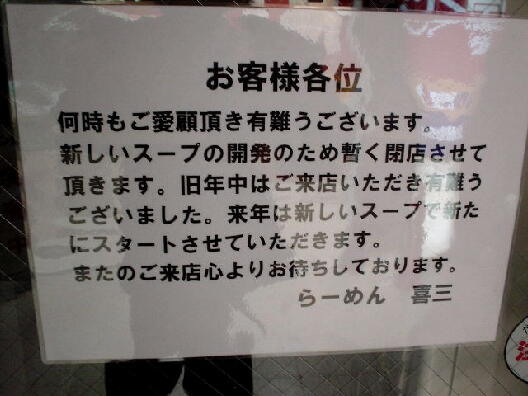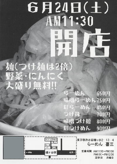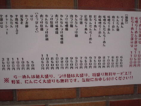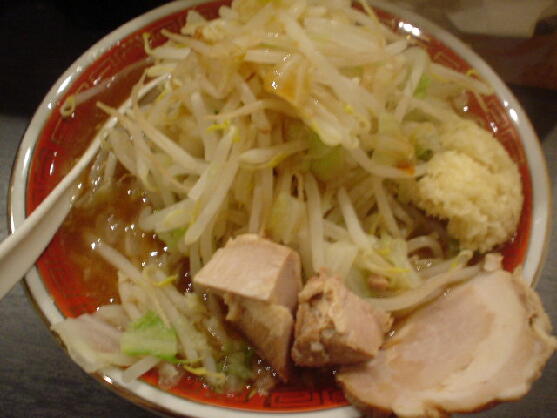ら−めん喜三 閉店 住所:渋谷区幡ヶ谷2-13-4 MAP 最寄り駅:京王線幡ヶ谷 営業時間:11:30-15:00 18:00-0:00 定休日:月 2006.6.24(SAT)開店 ![]() ![]() ![]() カウンターにはコショウ、七味唐辛子、醤油タレ。レンゲ有り。 2007・1 ![]() 2006・6・27(TUE) 二郎仲間のM君から、幡ヶ谷に二郎インスパイアの店が出来たと聞き訪問。 場所は幡ヶ谷駅の真上というとてもアクセスしやすい立地。 ![]() 北口より地上へ ![]() そのわきの通路の奥に黄色い看板がみえる。 なんだか新生府中をおもいだす。 ![]() 店の壁にはおおきな図入りの説明があり、二郎風であることはまちがいない。 というかこの文字フォントは。。。 ![]() 店の前に置かれたチラシ。 岩男に似てる・・・ そしてこのメニュー構成・・・ 店内は奥に厨房がありUの字のカウンターがのびている牛丼屋スタイル。 気になる紅らーめんとは辛味噌味とのこと。 間違いないまっち棒〜梵天系の店だ。 厨房には男性が3人。 とても威勢が良い。 狭い店内に声が響き渡る。 野菜多め、にんにくは食券提出時につたえる。 店内はいたってシンプル。 唯一の装飾品は奥に設置されたTVのみ。 ![]() ![]() らーめん 野菜多めにんにく¥650 醤油タレの香ばしい香りが丼から立ち昇ってくる。 スープは甘辛の味で二郎ほどではないがまっち棒系のなかでは濃い目でなかなかいける。 野菜の上からはほどよくタレがかけられている。 ブタは四角いサイコロ上の塊りと@状の柔らかいチャーシュー。 サイコロ状の方はしっかり醤油の味がしみておりしょっぱめだった。 にんにくは多め。 後半スープが減ったら結構からかった。 ![]() 近づけすぎてレンズが曇った・・・ 麺はとてもツルツルしていて食感は二郎っぽくはないが、しっかりとしたコシがあり喰い応えはある。 なかなかうまい。 まっち棒系のなかでは一番好み。 量は「麺少なめ党」の僕でも楽勝。 トータルでまっち棒系の中では二郎度は高め。 また、まっち棒系は店によって細かい違いがあり、もしかしてそのへんまで二郎をインスパイアしているのか。 ちなみにまっち棒の二郎風ラーメンの展開で自身が経営しているのは梵天のみ。 その他はプロドュースと言う形で関わっているようだ。 はたして喜三はどうなのだろう。 TOP |