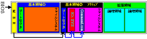 まずBIOSプログラムによってハードディスクの先頭セクターであるマスターブートレコード(MBR)が読み込まれる。次にアクティブな基本領域の先頭セクターであるブートセクターが読み込まれる。図では省略した形だが、厳密にはマスターブートレコード内のブートストラップローダがパーティションテーブルを検索してブートセクターを読み込む。