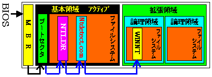 上図では、今度はWindowsNT/2000の例を示している。またOS固有の世界に入れば、論理領域にあるWINNTディレクトリなどにもアクセスできることを表現している。