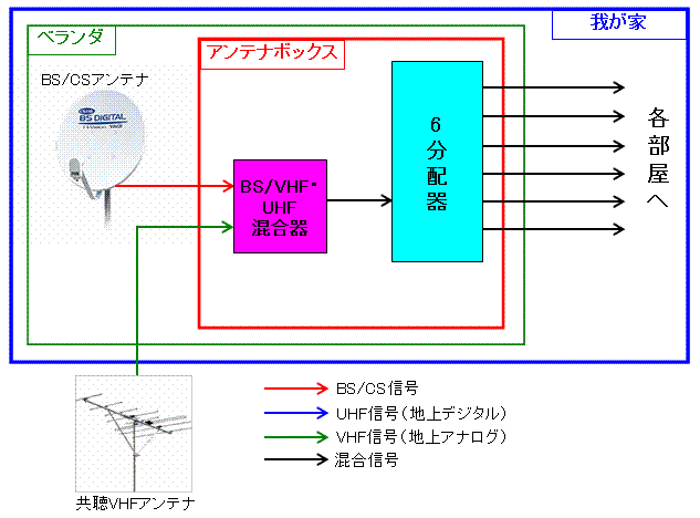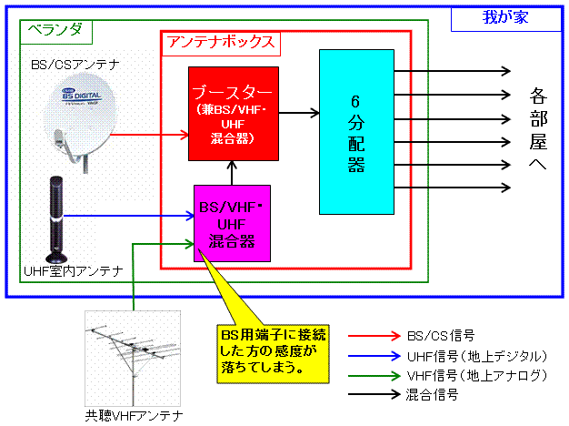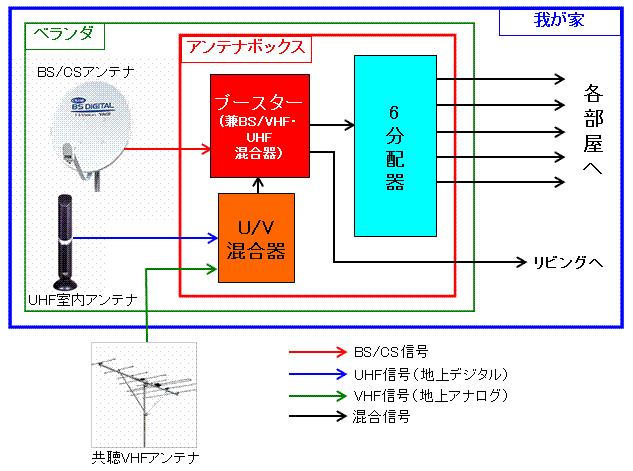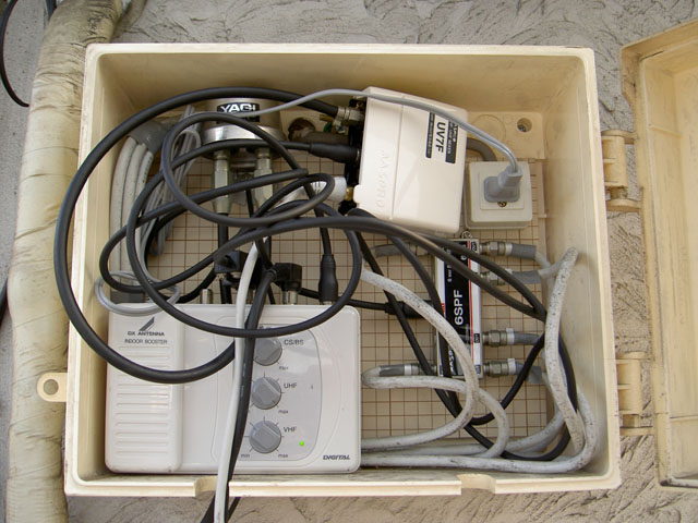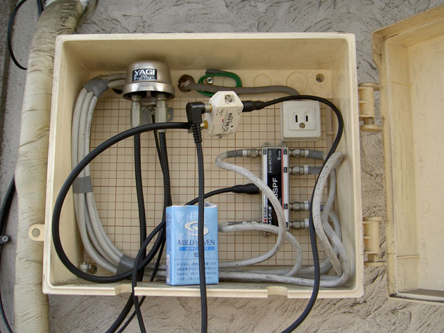 ひとついい方法が思い浮かびました。2階のベランダにアンテナを置くのです。2階のベランダには現在も共聴アンテナ、及びBSアンテナからのケーブルを一旦混合して、全6部屋に分配している アンテナボックスのようなボックスがあります。