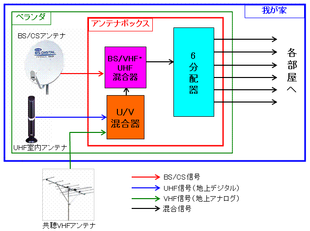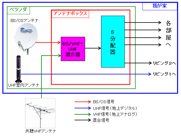 ここにもう一つ今回の室内アンテナを混合して、各部屋に分配すれば、アンテナの取り回しは何も考える必要がありません。それこそ全部屋で地上デジタルを視聴することができる訳で、全く最良の方法といえます。つまり以下のような構成です。
