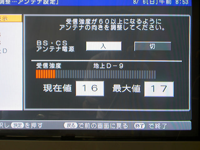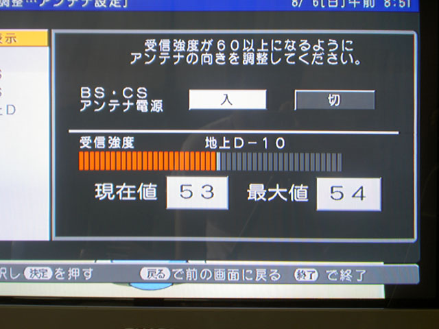 翌朝(7月30日)、あきらめずにというか、あきらめきれずにもう一度だけ接続を試みてみました。ところがなぜかうまくいくではありませんか。受信レベルもよい局で 50前後、TVKも何とか視聴できる40台となりました。決して安定的とは言えませんが、とりあえず視聴可能というレベルにはたどり着くことができました。