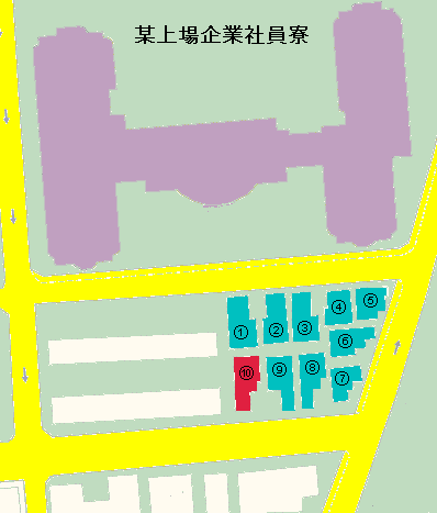 建て売りは通常何棟かあるものですが、うちの場合10棟建てでした。そしてその10棟全部が当該社員寮による電波障害を受けていました。[地図1]