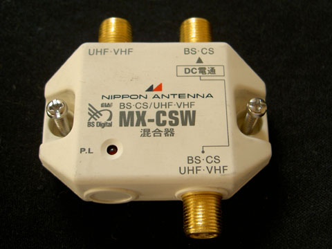 ただしこの時点では、すべての問題が解決した訳ではありません。今まではアンテナボックスでは、BSとVHF/UHFをBS・CS/UHF・VHF混合器(日本アンテナMX-CSW 下図参照)で混合していました。