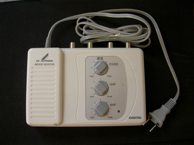 そこでWebでいろいろ調べてみると、何とブースタはまさしくこのような場合に有効であることが分かってきました。ブースタは単に電波の増幅ではなく、分配による損失やケーブル損失などの補填に真価を発揮するようです。ここまできたらブースタを買う他ないと思いました。幸いこのベランダのアンテナボックスには電源が来ていました(恐らくブースタの利用を想定して予め設計されていたのでしょう)。こうなってくると、すぐにでも何とかしたくなる性分の私は、もうブースタをゆっくりWebで探す余裕はなく、朝一番でヨドバシカメラ川崎店に飛んでいきました。