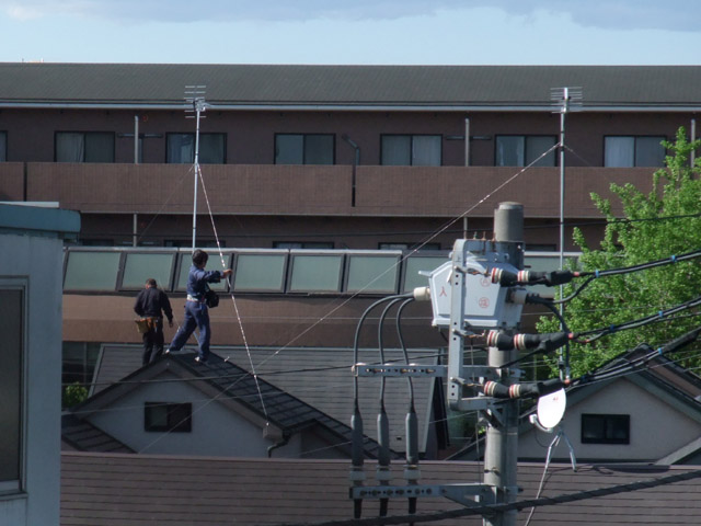 左側の今設置中のアンテナが我が家のアンテナで、向こうに見える建物が某上場企業の社員寮である電波障害の元になっている建物(5階建て)です。この建物の遥か先に東京タワーがある訳です。アンテナの高さは建物の高さを超えてはいないのが分かると思います。これくらいにできれば今回のようなアンテナレベルは確保できるということですね。この建物が7階以上あったら、こうはいかなかったかもしれませんし、10階以上ならほぼ絶望的でしょう。