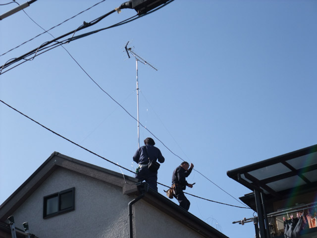 これでうちでもアンテナ立てれば見られると確信し、もはや診断なしで立ててもらうことにしました。勿論先の診断をしてくれた業者とは別の業者を頼みました。一応見積もりには来てもらいました。特に屋根に上るのに特別難しいといった事情もないので、工事は基本料金(アンテナ代、屋根馬、ポール、設置費込み)の19,800円で実施してくるとのこと。ただブースター(25,000円)が見積もりに入っていました。先のアンテナ診断のこともあったので、プロの意見でも鵜呑みにしないと決めていたため、これは独断で断りました。今ある室内用のブースターで十分。もしかしたらこれもいらないかもしれないし、そもそも利得を高めるために屋外アンテナ立てるのに現在以上の能力のブースターが必要になるのは本末転倒と考えたからです。また見積もりのブースターはUHFだけでなく、VHFもBSもブーストするタイプでした。これには不誠実さを感じました。見積もり時にBSはブーストなしで使っているのを見ておきながら、高いBS対応のブースターを見積もりに入れるなど、この業者も決して信用はできない。万が一ブースターのグレードアップが必要な場合でも自分で調査して最適なものをネットで格安で買おうと思い、とにかく設置だけしてくれればいいということで工事をお願いしました。