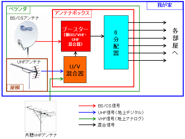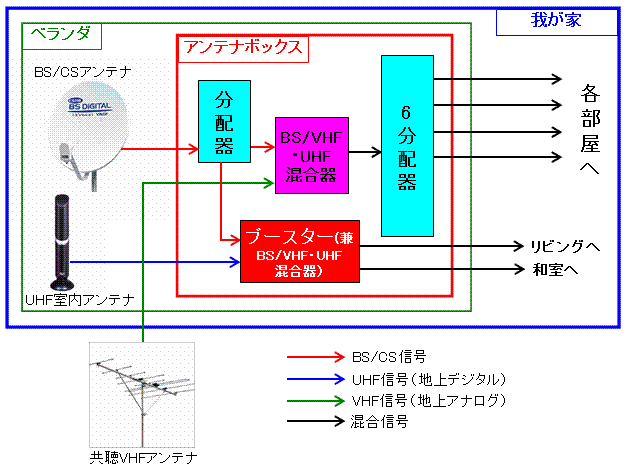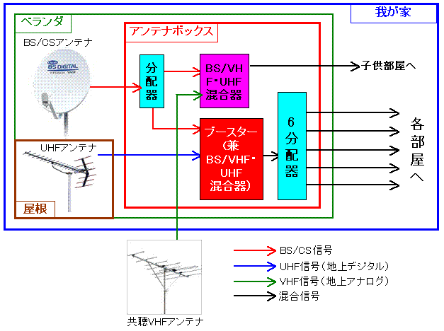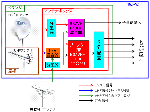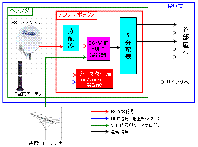 そんな訳で急遽地上アナログ画質の改善に取り掛かった訳です。放映は2007年11月19日(月)です。UHFと混合させなければいいのは分かっているので、この放映を録画することだけに注力するなら、一時的に配線を変えることでも対応できますが、前述のように両親のためもあり、恒常的な環境としたいと考えました。両親はNHK BSも非常に気に入っているということなので、その要望にも答える必要があります。その結果以下のような配線になりました。