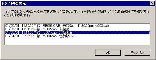 後は画面の説明に従っていけば分かると思います。基本的にはバックアップファイルリストが日付つきで出てくるので、選択するだけです。復元が完了したら、普通に起動して下さい。復元したレジストリで起動するはずです。